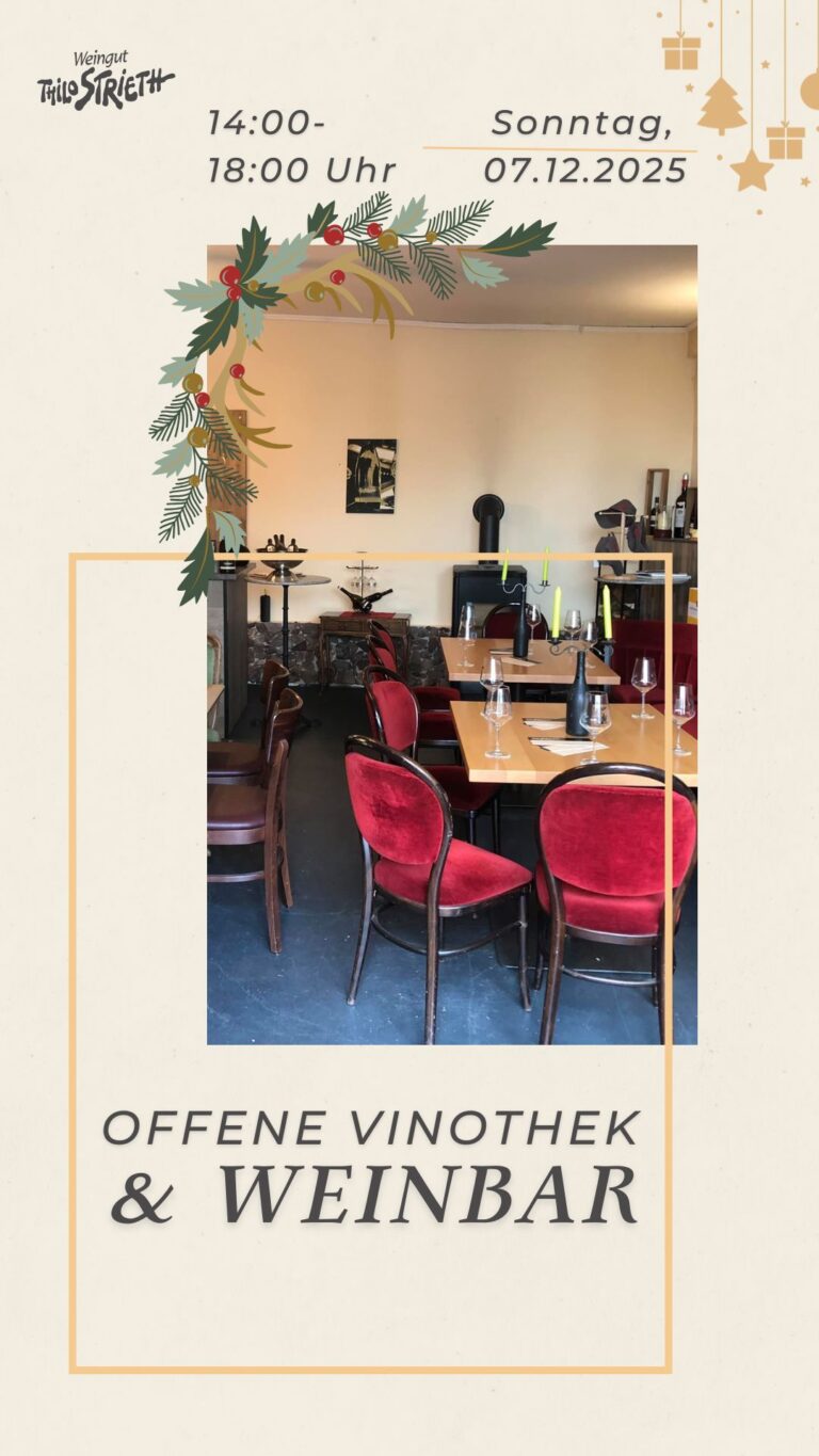 Ein letztes Mal in diesem Jahr öffnen wir unsere Vinothek. Gern beraten wir Sie, welche Weine zu Ihrem Festtagsmenü passen oder sich als Geschenk eignen.